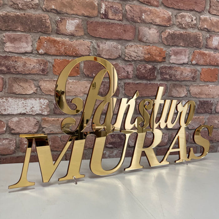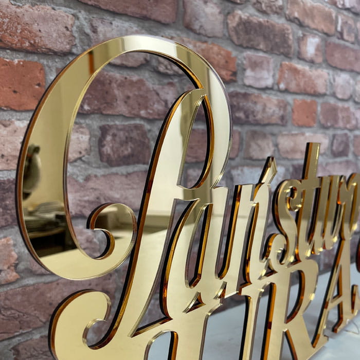 - Lustrzana Pleksi w kolorze złotym lub srebrnym: Jeśli wolisz nowoczesny i błyszczący wygląd, możesz wybrać napis z lustrzanego złotego lub srebrnego pleksi. Napisy z pleksi są dodatkowo wzmocnione płytą HDF od spodu, co zapewnia trwałość i stabilność.